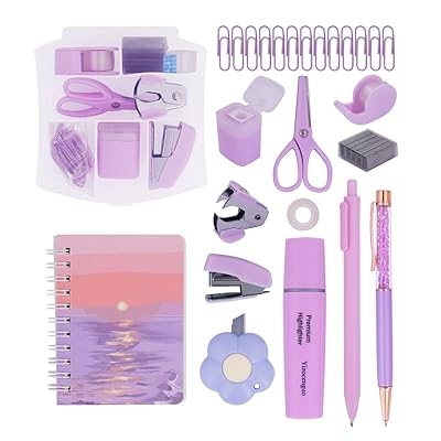 Mini Office Supply Kit Includes Stapler Tape Dispenser Staple Remover Paper Clips Scissor Notebook Highlighter Ballpoint Pen Small Telescopic Knife for Office and School Student Purple Set